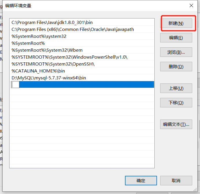 点击新建复制进去自己的MySQL目录 比如:D:\MySQL\mysql-5.7.37-winx64\bin添加完毕之后点击确定
