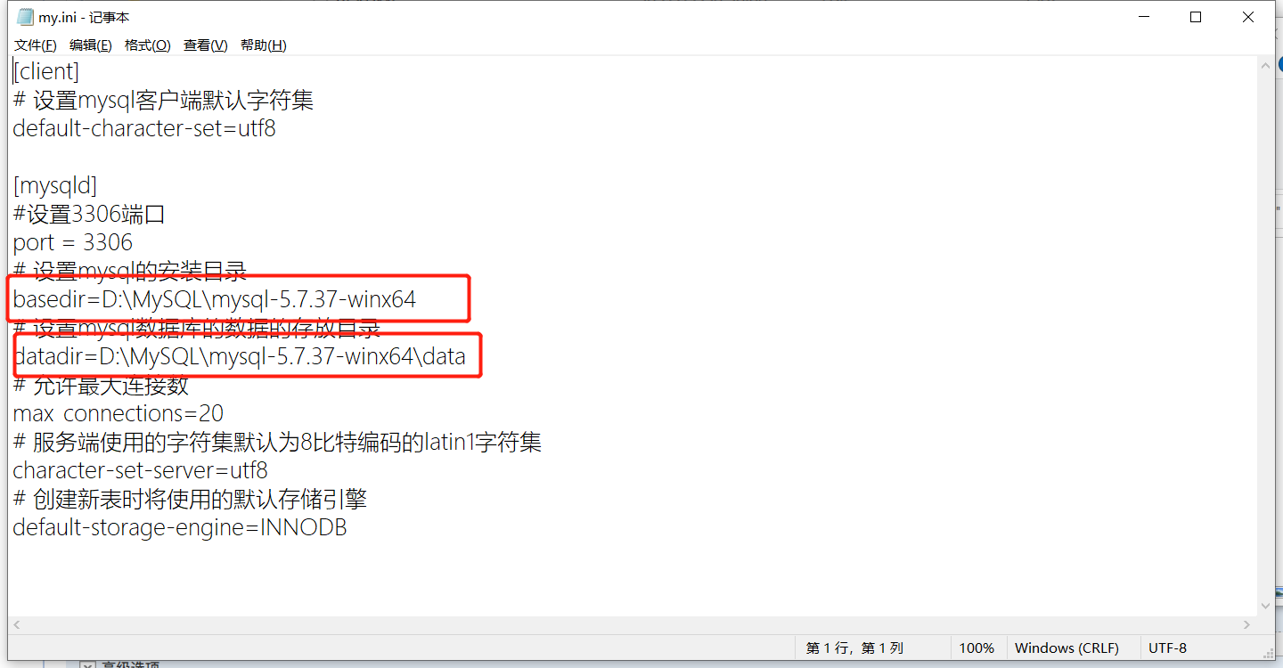 用记事本方法打开 my.ini在里面输入这段代码,记得表框的地方一定要改为自己的mysql目录输入完成之后Ctrl+s保存即可关闭