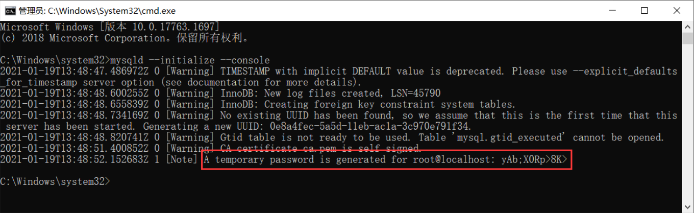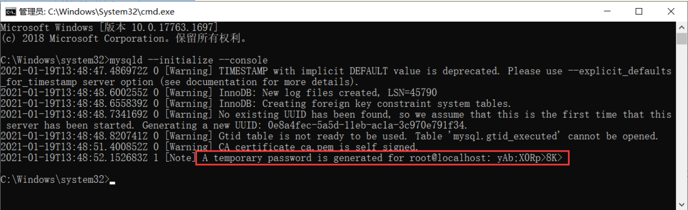 在命令行输入命令 mysqld --initialize --conlose