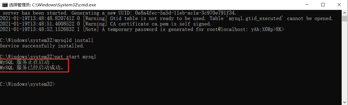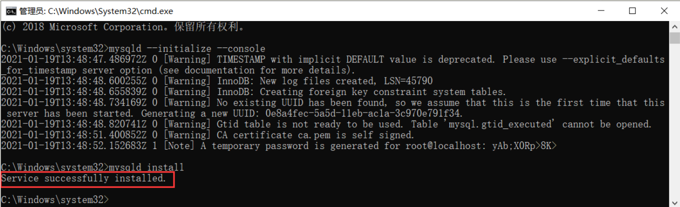 如果报 Could not create or access the registry key needed for the MySQL application to log to the Windows 的错误,是因为不是以管理员身份运行cmd命令行的。