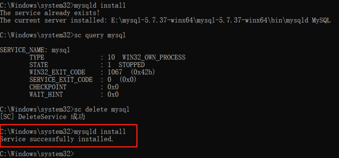 删除命令后 可以再次输入安装命令:mysqld install 出现红色表框命令说明已经安装成功