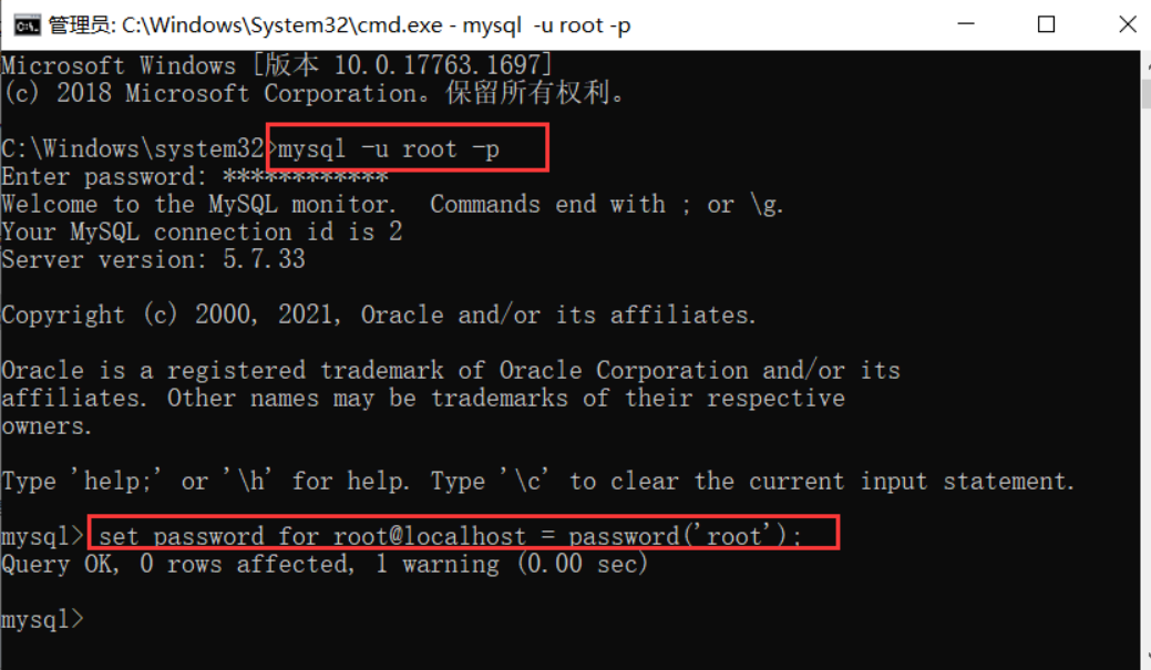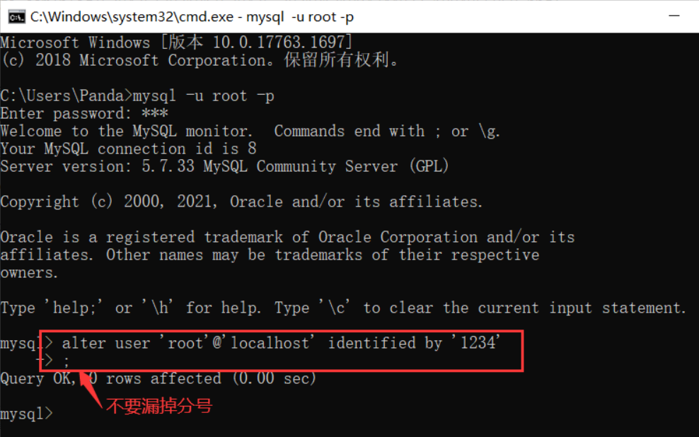 输入 set password for root@localhost = password('root'); (期中root为自己想输入的密码 记住千万不要漏掉分号 不然会一直进行输入)
