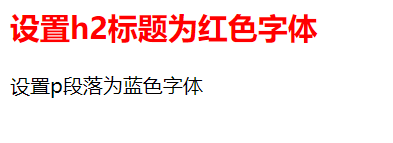 <!doctype html> <html> <head> <meta charset="utf-8"> <title>style标记的使用</title> <style type="text/css"> h2{color: blue;} p{color: black;} </style> </head> <body> <h2>设置h2标题为红色字体</h2> <p>设置p段落为蓝色字体</p> </body> </html>