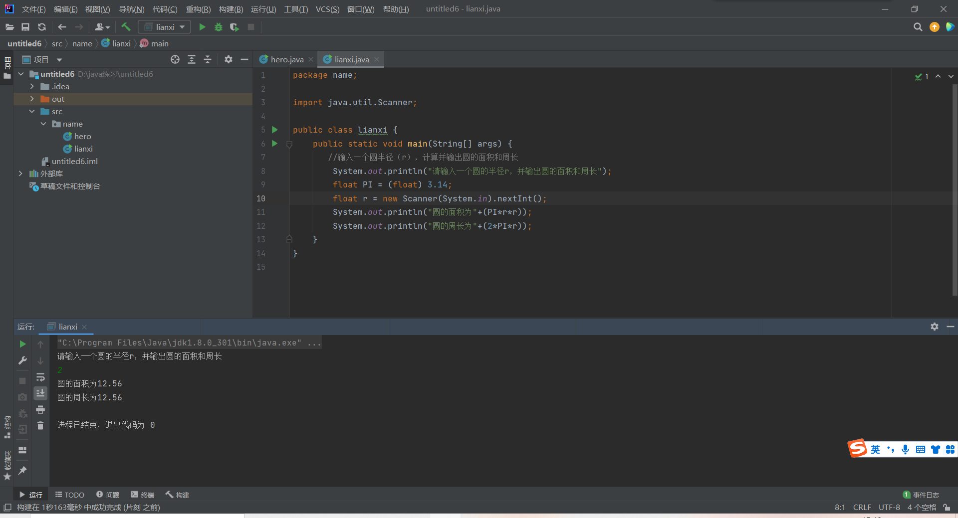 2、 输入一个圆半径(r),计算并输出圆的面积和周长。