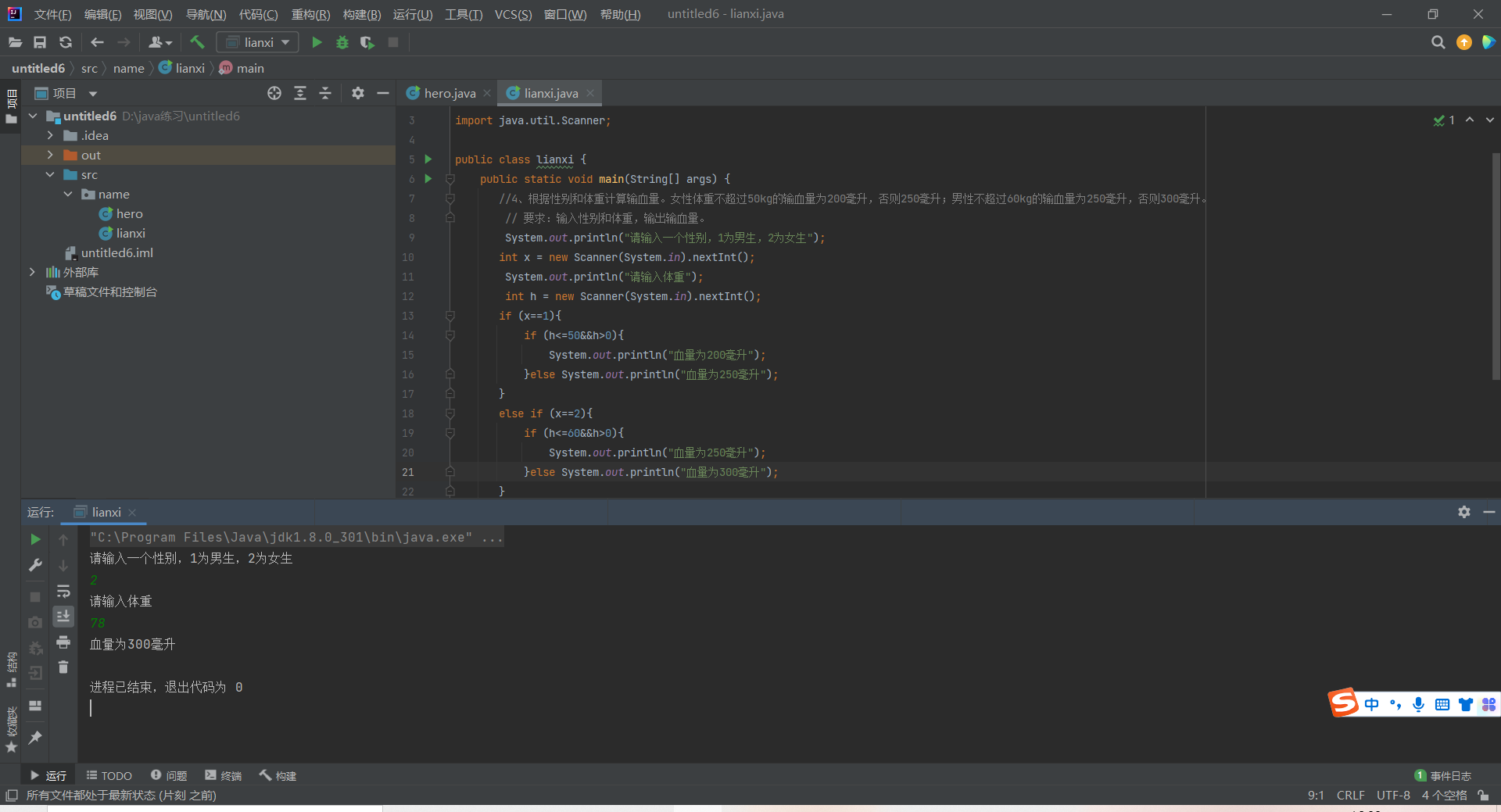 4、根据性别和体重计算输血量。女性体重不超过50kg的输血量为200毫升,否则250毫升;男性不超过60kg的输血量为250毫升,否则300毫升。要求:输入性别和体重,输出输血量。