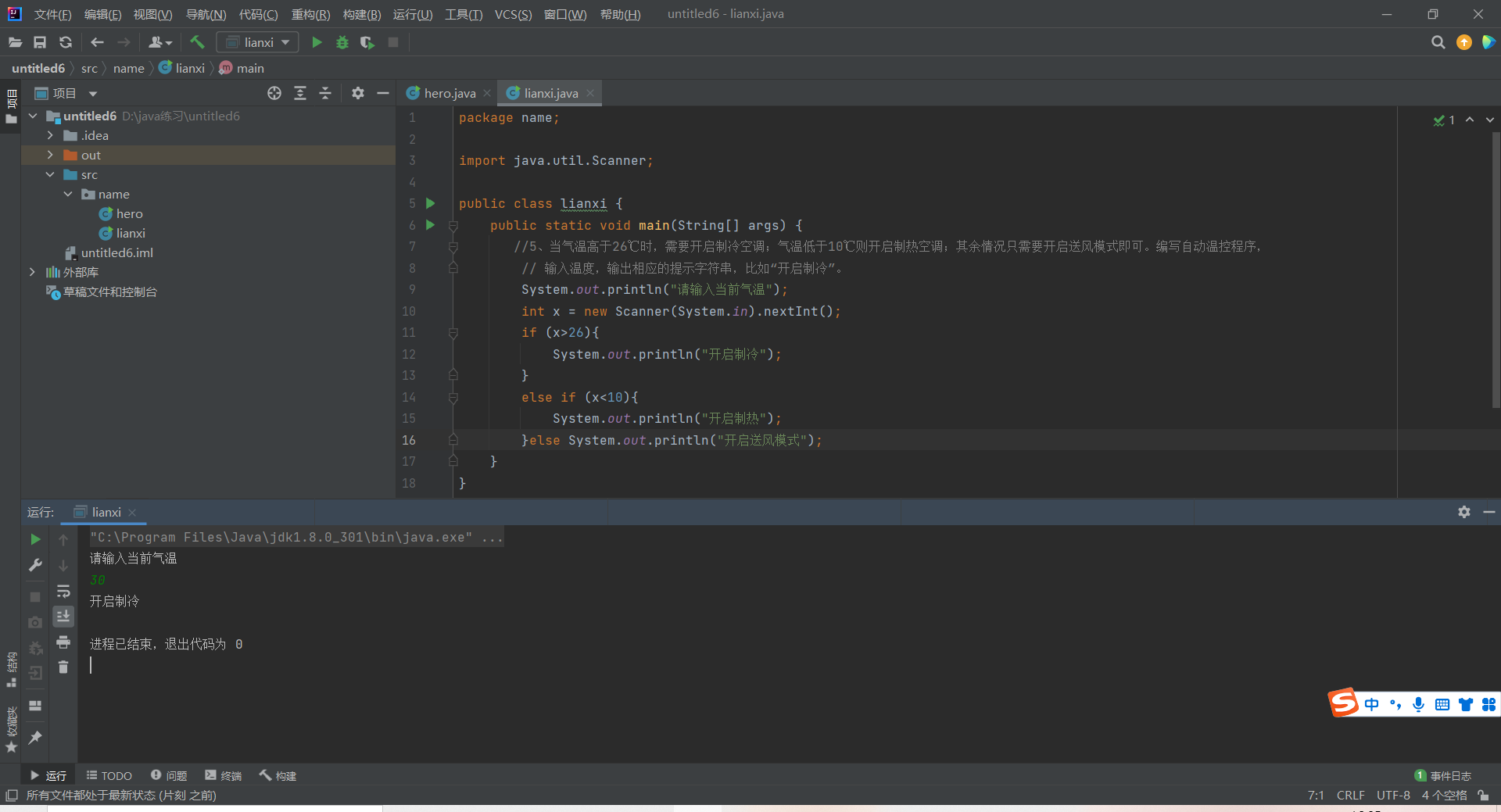 5、当气温高于26℃时,需要开启制冷空调;气温低于10℃则开启制热空调;其余情况只需要开启送风模式即可。编写自动温控程序,输入温度,输出相应的提示字符串,比如“开启制冷”。