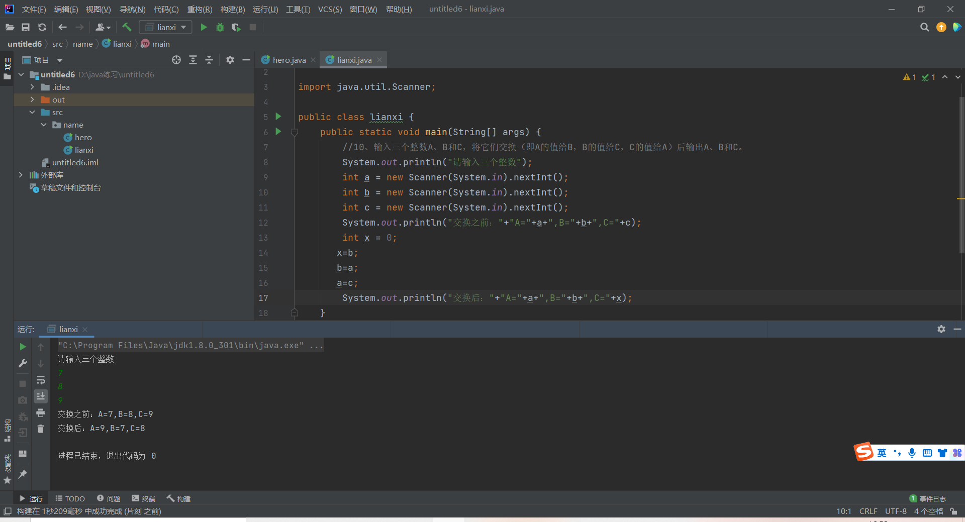 10、输入三个整数A、B和C,将它们交换(即A的值给B,B的值给C,C的值给A)后输出A、B和C。