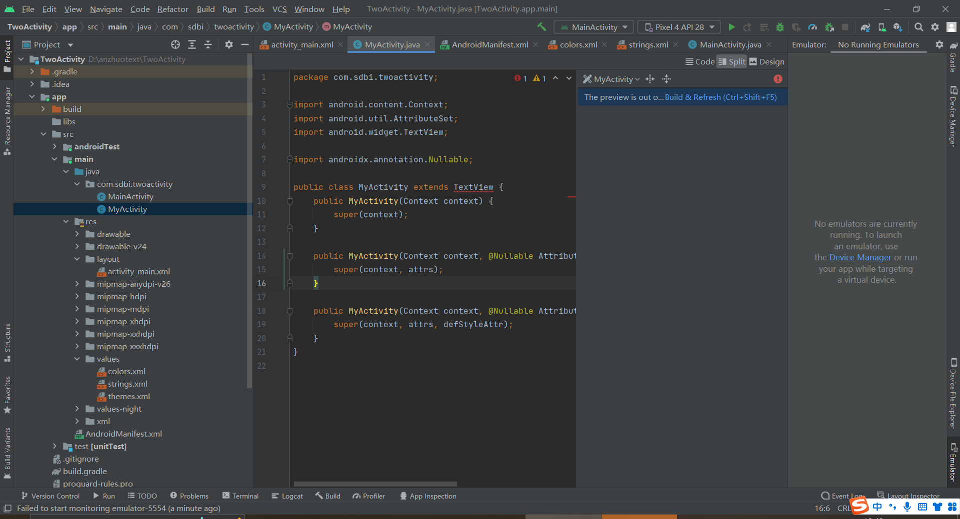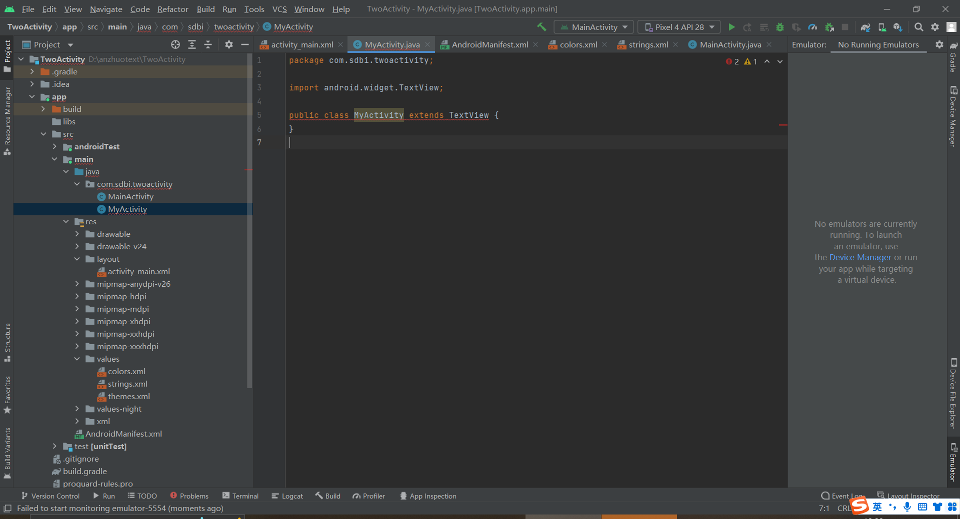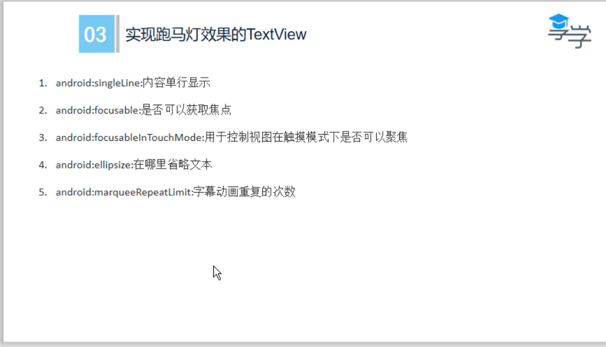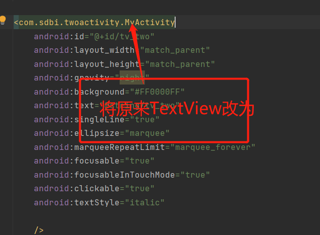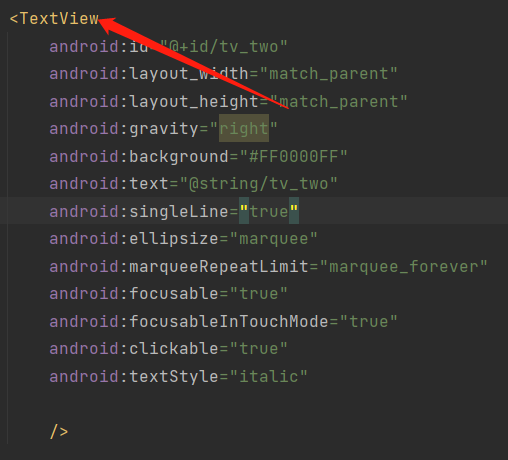 <TextView android:id="@+id/tv_two" android:layout_width="match_parent" android:layout_height="match_parent" android:gravity="right" android:background="#FF0000FF" android:text="@string/tv_two" android:singleLine="true" android:ellipsize="marquee" android:marqueeRepeatLimit="marquee_forever" android:focusable="true" android:focusableInTouchMode="true" android:clickable="true" android:textStyle="italic" />