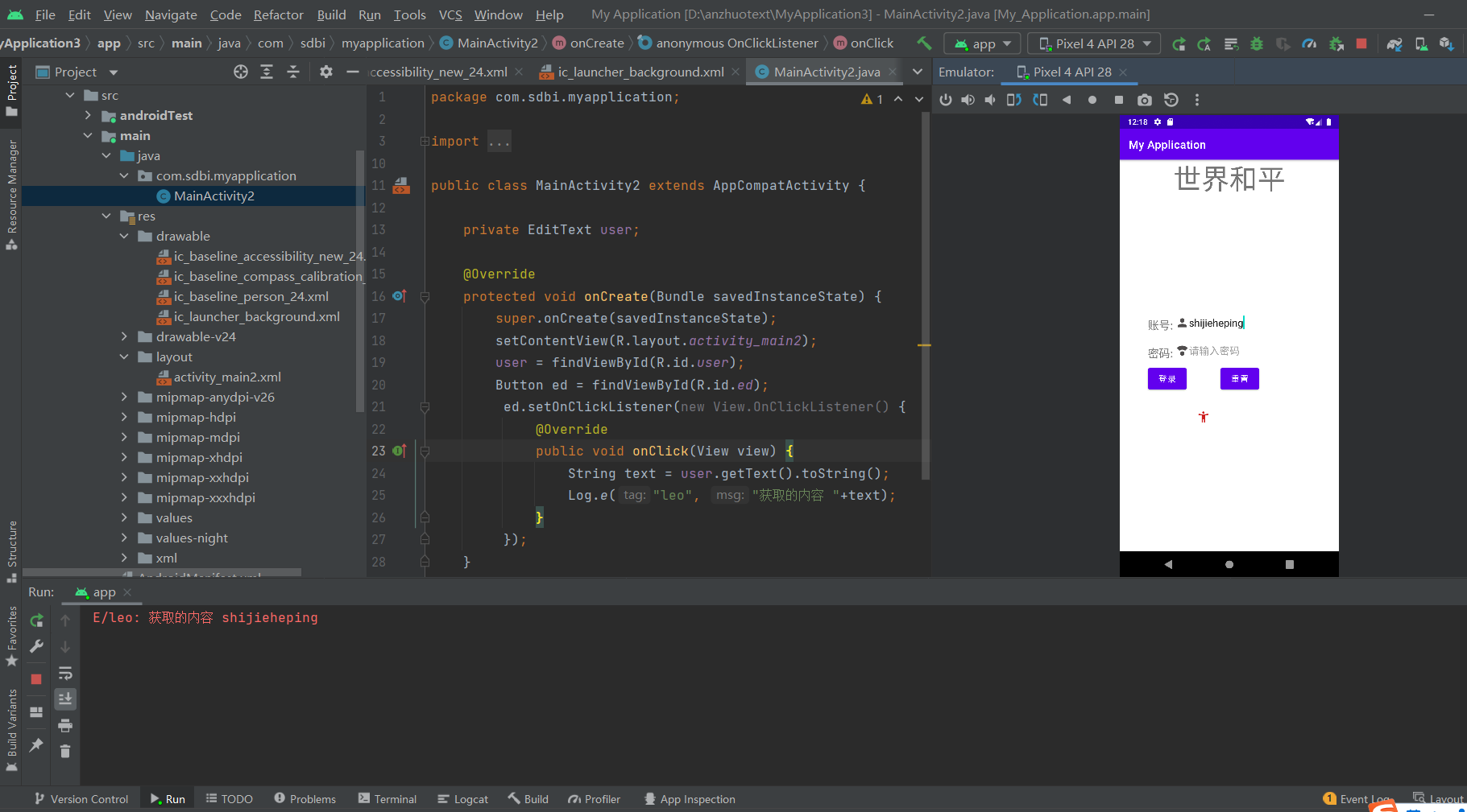 protected void onCreate(Bundle savedInstanceState) { super.onCreate(savedInstanceState); setContentView(R.layout.activity_main2); user = findViewById(R.id.user); Button ed = findViewById(R.id.ed); ed.setOnClickListener(new View.OnClickListener() { @Override public void onClick(View view) { String text = user.getText().toString(); Log.e("leo", "获取的内容 "+text); } }); }