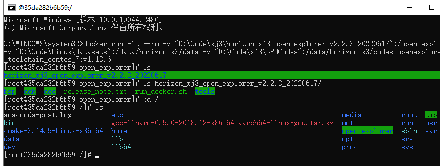 docker run -it --rm -v "D:\Code\xj3\horizon_xj3_open_explorer_v2.2.3_20220617":/open_explorer -v "D:\Code\Linux\datasets":/data/horizon_x3/data -v "D:\Code\xj3\BPUCodes":/data/horizon_x3/codes openexplorer/ai_toolchain_centos_7:v1.13.6