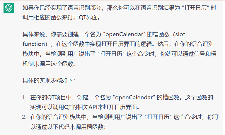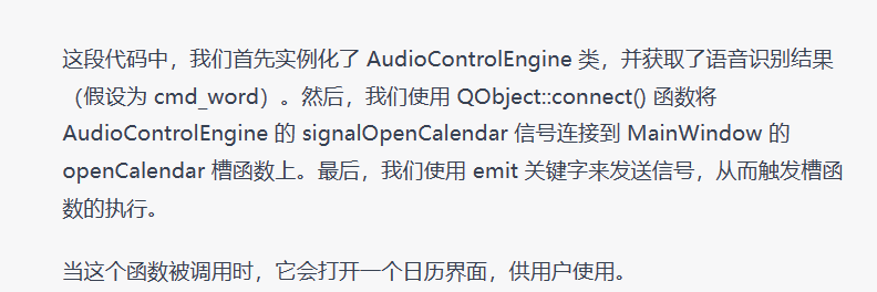 AudioControlEngine audio_engine; // 获取语音识别结果,假设为cmd_word if (cmd_word == "打开日历") { QObject::connect(&audio_engine, &AudioControlEngine::signalOpenCalendar, w, &MainWindow::openCalendar); emit audio_engine.signalOpenCalendar(); }