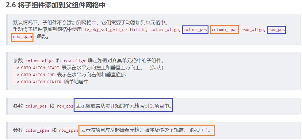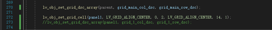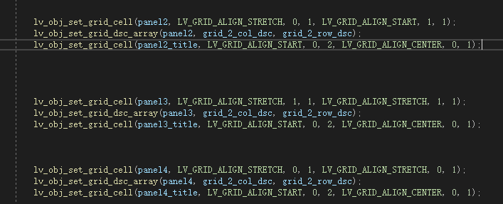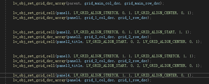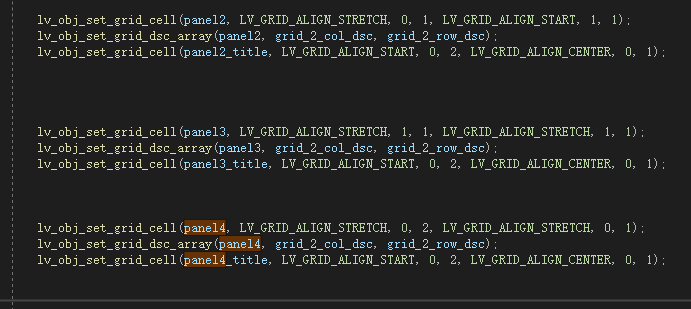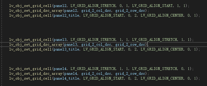 lv_obj_set_grid_cell(panel1, LV_GRID_ALIGN_STRETCH, 0, 2, LV_GRID_ALIGN_CENTER, 0, 1); lv_obj_set_grid_dsc_array(panel1, grid_1_col_dsc, grid_1_row_dsc); lv_obj_set_grid_cell(panel2, LV_GRID_ALIGN_STRETCH, 0, 1, LV_GRID_ALIGN_START, 1, 1); lv_obj_set_grid_dsc_array(panel2, grid_2_col_dsc, grid_2_row_dsc); lv_obj_set_grid_cell(panel2_title, LV_GRID_ALIGN_START, 0, 2, LV_GRID_ALIGN_CENTER, 0, 1); lv_obj_set_grid_cell(panel3, LV_GRID_ALIGN_STRETCH, 1, 1, LV_GRID_ALIGN_STRETCH, 1, 1); lv_obj_set_grid_dsc_array(panel3, grid_2_col_dsc, grid_2_row_dsc); lv_obj_set_grid_cell(panel3_title, LV_GRID_ALIGN_START, 0, 2, LV_GRID_ALIGN_CENTER, 0, 1);