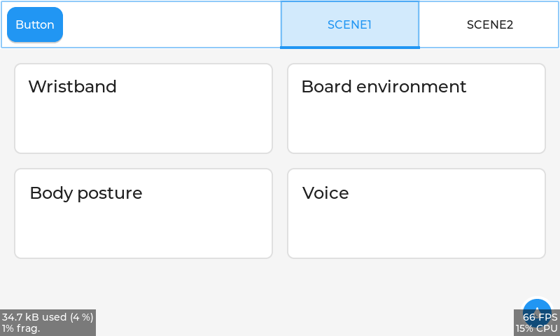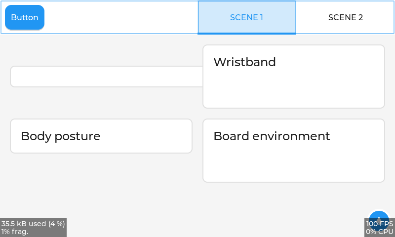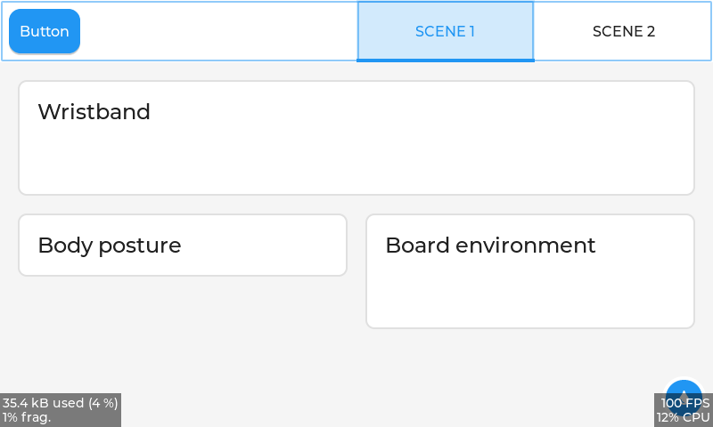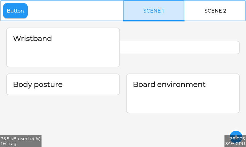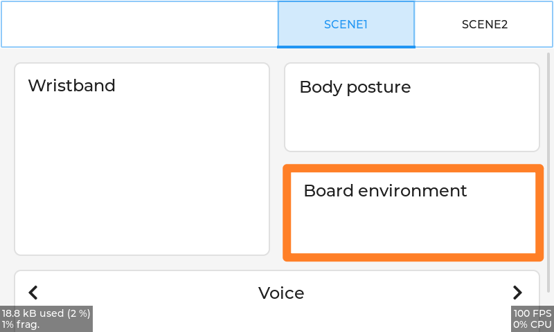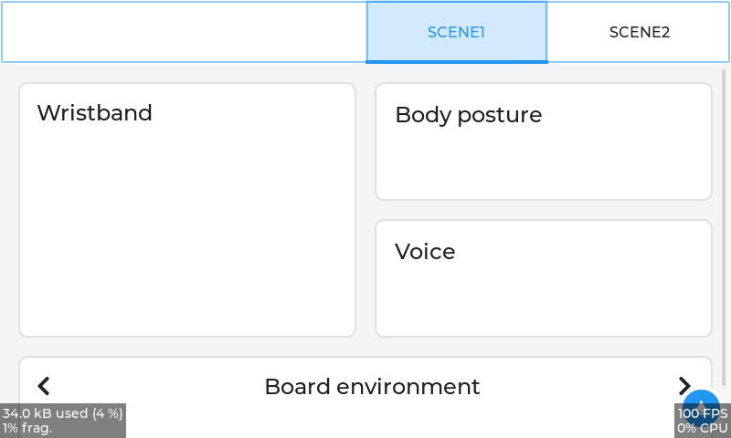 static void profile_create(lv_obj_t* parent) { lv_obj_t* panel1 = lv_obj_create(parent); //lv_obj_set_height(panel1, LV_SIZE_CONTENT); lv_obj_t* panel_title = lv_label_create(panel1); lv_label_set_text(panel_title, "Wristband"); lv_obj_add_style(panel_title, &style_title, 0); /*Create a keyboard*/ /*Create the second panel*/ lv_obj_t* panel2 = lv_obj_create(parent); //lv_obj_set_height(panel2, LV_SIZE_CONTENT); lv_obj_t* panel2_title = lv_label_create(panel2); lv_label_set_text(panel2_title, "Body posture"); lv_obj_add_style(panel2_title, &style_title, 0); /*Create the third panel*/ lv_obj_t* panel3 = lv_obj_create(parent); //lv_obj_set_height(panel3, LV_SIZE_CONTENT); lv_obj_t* panel3_title = lv_label_create(panel3); lv_label_set_text(panel3_title, "Voice"); lv_obj_add_style(panel3_title, &style_title, 0); /*Create the fourth panel*/ lv_obj_t* panel4 = lv_obj_create(parent); //lv_obj_set_height(panel4, LV_SIZE_CONTENT); lv_obj_t* panel4_title = lv_label_create(panel4); lv_label_set_text(panel4_title, LV_SYMBOL_LEFT " Board environment " LV_SYMBOL_RIGHT); lv_obj_add_style(panel4_title, &style_title, 0); //lv_label_set_text(panel4_title, LV_SYMBOL_LEFT ); if (disp_size == DISP_LARGE) { static lv_coord_t grid_main_col_dsc[] = { LV_GRID_FR(1), LV_GRID_FR(1), LV_GRID_TEMPLATE_LAST }; static lv_coord_t grid_main_row_dsc[] = { LV_GRID_CONTENT, LV_GRID_CONTENT, LV_GRID_CONTENT, LV_GRID_CONTENT, LV_GRID_CONTENT, LV_GRID_CONTENT, LV_GRID_CONTENT, LV_GRID_TEMPLATE_LAST }; /*Create the top panel*/ static lv_coord_t grid_1_col_dsc[] = { LV_GRID_CONTENT, 5, LV_GRID_CONTENT, LV_GRID_FR(2), LV_GRID_FR(1), LV_GRID_FR(1), LV_GRID_TEMPLATE_LAST }; static lv_coord_t grid_1_row_dsc[] = { LV_GRID_CONTENT, LV_GRID_CONTENT, 10, LV_GRID_CONTENT, LV_GRID_CONTENT, LV_GRID_TEMPLATE_LAST }; static lv_coord_t grid_2_col_dsc[] = { LV_GRID_FR(1), LV_GRID_FR(1), LV_GRID_TEMPLATE_LAST }; static lv_coord_t grid_2_row_dsc[] = { LV_GRID_CONTENT, /*Title*/ 5, /*Separator*/ LV_GRID_CONTENT, /*Box title*/ 30, /*Boxes*/ 5, /*Separator*/ LV_GRID_CONTENT, /*Box title*/ 30, /*Boxes*/ LV_GRID_TEMPLATE_LAST }; lv_obj_set_grid_dsc_array(parent, grid_main_col_dsc, grid_main_row_dsc); lv_obj_set_grid_cell(panel1, LV_GRID_ALIGN_STRETCH, 0, 1, LV_GRID_ALIGN_STRETCH, 0, 2); lv_obj_set_grid_dsc_array(panel1, grid_1_col_dsc, grid_1_row_dsc); lv_obj_set_grid_cell(panel2, LV_GRID_ALIGN_STRETCH, 1, 1, LV_GRID_ALIGN_START, 0, 1); lv_obj_set_grid_dsc_array(panel2, grid_2_col_dsc, grid_2_row_dsc); lv_obj_set_grid_cell(panel2_title, LV_GRID_ALIGN_START, 0, 2, LV_GRID_ALIGN_CENTER, 0, 1); lv_obj_set_grid_cell(panel3, LV_GRID_ALIGN_STRETCH, 1, 1, LV_GRID_ALIGN_STRETCH, 1, 1); lv_obj_set_grid_dsc_array(panel3, grid_2_col_dsc, grid_2_row_dsc); lv_obj_set_grid_cell(panel3_title, LV_GRID_ALIGN_START, 0, 2, LV_GRID_ALIGN_CENTER, 0, 1); lv_obj_set_grid_cell(panel4, LV_GRID_ALIGN_STRETCH, 0, 2, LV_GRID_ALIGN_CENTER, 2, 1); lv_obj_set_grid_dsc_array(panel4, grid_1_col_dsc, grid_1_row_dsc); } else if (disp_size == DISP_MEDIUM) { static lv_coord_t grid_main_col_dsc[] = { LV_GRID_FR(1), LV_GRID_FR(1), LV_GRID_TEMPLATE_LAST }; static lv_coord_t grid_main_row_dsc[] = { LV_GRID_CONTENT, LV_GRID_CONTENT, LV_GRID_TEMPLATE_LAST }; /*Create the top panel*/ static lv_coord_t grid_1_col_dsc[] = { LV_GRID_CONTENT, 1, LV_GRID_CONTENT, LV_GRID_FR(1), LV_GRID_TEMPLATE_LAST }; static lv_coord_t grid_1_row_dsc[] = { LV_GRID_CONTENT, /*Name*/ LV_GRID_CONTENT, /*Description*/ LV_GRID_CONTENT, /*Email*/ -20, LV_GRID_CONTENT, /*Phone*/ LV_GRID_CONTENT, /*Buttons*/ LV_GRID_TEMPLATE_LAST }; static lv_coord_t grid_2_col_dsc[] = { LV_GRID_FR(1), LV_GRID_FR(1), LV_GRID_TEMPLATE_LAST }; static lv_coord_t grid_2_row_dsc[] = { LV_GRID_CONTENT, /*Title*/ 5, /*Separator*/ LV_GRID_CONTENT, /*Box title*/ 40, /*Box*/ LV_GRID_CONTENT, /*Box title*/ 40, /*Box*/ LV_GRID_CONTENT, /*Box title*/ 40, /*Box*/ LV_GRID_CONTENT, /*Box title*/ 40, /*Box*/ LV_GRID_TEMPLATE_LAST }; lv_obj_set_grid_dsc_array(parent, grid_main_col_dsc, grid_main_row_dsc); lv_obj_set_grid_cell(panel1, LV_GRID_ALIGN_STRETCH, 0, 2, LV_GRID_ALIGN_CENTER, 0, 1); lv_obj_set_grid_dsc_array(panel1, grid_1_col_dsc, grid_1_row_dsc); lv_obj_set_grid_cell(panel2, LV_GRID_ALIGN_STRETCH, 0, 1, LV_GRID_ALIGN_START, 1, 1); lv_obj_set_grid_dsc_array(panel2, grid_2_col_dsc, grid_2_row_dsc); lv_obj_set_grid_cell(panel2_title, LV_GRID_ALIGN_START, 0, 2, LV_GRID_ALIGN_CENTER, 0, 1); lv_obj_set_grid_cell(panel3, LV_GRID_ALIGN_STRETCH, 1, 1, LV_GRID_ALIGN_STRETCH, 1, 1); lv_obj_set_grid_dsc_array(panel3, grid_2_col_dsc, grid_2_row_dsc); lv_obj_set_grid_cell(panel3_title, LV_GRID_ALIGN_START, 0, 2, LV_GRID_ALIGN_CENTER, 0, 1); lv_obj_set_grid_cell(panel4, LV_GRID_ALIGN_STRETCH, 0, 2, LV_GRID_ALIGN_CENTER, 0, 1); lv_obj_set_grid_dsc_array(panel4, grid_1_col_dsc, grid_1_row_dsc); } else if (disp_size == DISP_SMALL) { static lv_coord_t grid_main_col_dsc[] = { LV_GRID_FR(1), LV_GRID_TEMPLATE_LAST }; static lv_coord_t grid_main_row_dsc[] = { LV_GRID_CONTENT, LV_GRID_CONTENT, LV_GRID_CONTENT, LV_GRID_TEMPLATE_LAST }; lv_obj_set_grid_dsc_array(parent, grid_main_col_dsc, grid_main_row_dsc); /*Create the top panel*/ static lv_coord_t grid_1_col_dsc[] = { LV_GRID_CONTENT, LV_GRID_FR(1), LV_GRID_TEMPLATE_LAST }; static lv_coord_t grid_1_row_dsc[] = { LV_GRID_CONTENT, /*Avatar*/ LV_GRID_CONTENT, /*Name*/ LV_GRID_CONTENT, /*Description*/ LV_GRID_CONTENT, /*Email*/ LV_GRID_CONTENT, /*Phone number*/ LV_GRID_CONTENT, /*Button1*/ LV_GRID_CONTENT, /*Button2*/ LV_GRID_TEMPLATE_LAST }; lv_obj_set_grid_dsc_array(panel1, grid_1_col_dsc, grid_1_row_dsc); static lv_coord_t grid_2_col_dsc[] = { LV_GRID_FR(1), LV_GRID_FR(1), LV_GRID_TEMPLATE_LAST }; static lv_coord_t grid_2_row_dsc[] = { LV_GRID_CONTENT, /*Title*/ 5, /*Separator*/ LV_GRID_CONTENT, /*Box title*/ 40, /*Box*/ LV_GRID_CONTENT, /*Box title*/ 40, /*Box*/ LV_GRID_CONTENT, /*Box title*/ 40, /*Box*/ LV_GRID_CONTENT, /*Box title*/ 40, LV_GRID_TEMPLATE_LAST /*Box*/ }; lv_obj_set_grid_dsc_array(panel2, grid_2_col_dsc