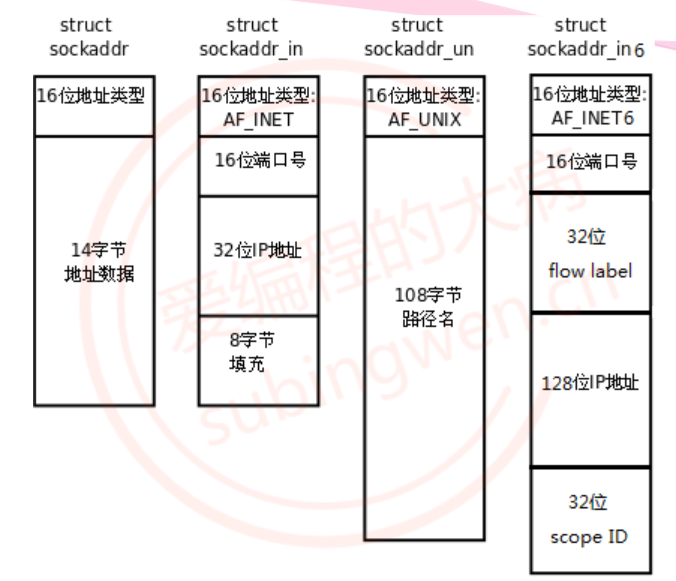// 在写数据的时候不好用 struct sockaddr { sa_family_t sa_family; // 地址族协议, ipv4 char sa_data[14]; // 端口(2字节) + IP地址(4字节) + 填充(8字节) } typedef unsigned short uint16_t; typedef unsigned int uint32_t; typedef uint16_t in_port_t; typedef uint32_t in_addr_t; typedef unsigned short int sa_family_t; #define __SOCKADDR_COMMON_SIZE (sizeof (unsigned short int)) struct in_addr { in_addr_t s_addr; }; // sizeof(struct sockaddr) == sizeof(struct sockaddr_in) struct sockaddr_in { sa_family_t sin_family; /* 地址族协议: AF_INET */ in_port_t sin_port; /* 端口, 2字节-> 大端 */ struct in_addr sin_addr; /* IP地址, 4字节 -> 大端 */ /* 填充 8字节 */ unsigned char sin_zero[sizeof (struct sockaddr) - sizeof(sin_family) - sizeof (in_port_t) - sizeof (struct in_addr)]; };