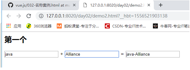 ①在vue对象中写computed属性:然后配置相应的“计算属性”,比如本例里面配置“fullname”属性,然后与<div id下的fullname文本框绑定, 然后在computed里给fullname配置相应的function即可