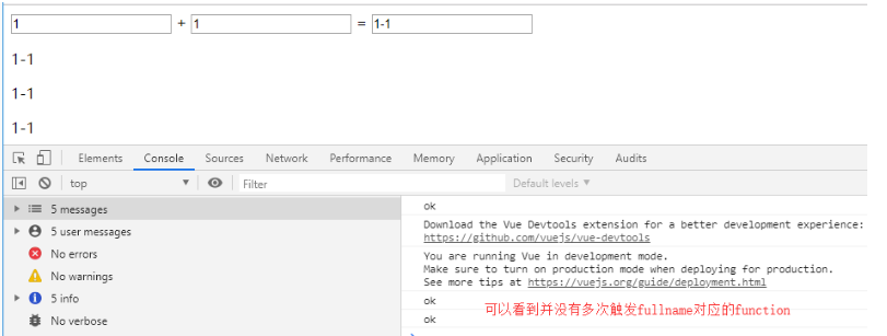 运行结果截图: 解释一下控制台的两个ok分别是我们输入firstname和lastname而触发fullname对应的function,而我们在上面代码中虽然多次写了<p{{fullname}}</p 但是由于fullname :function里用到的数据没有发生变化,所以不会触发fullname :function
