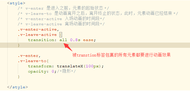 先看代码部分如下: 讲解:可以看到在.v-enter, .v-leave-to里面写了一个 transform: translateX(100px);就是说“进入的起点”和“离开的终点”的位置都在(100px,0)处,然后要注意transition组件必须要包在一个v-if或v-show的外面,不然的话不起作用