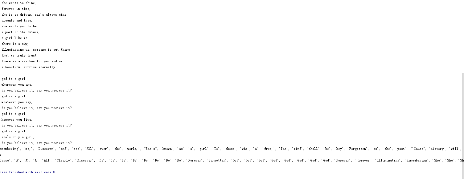 strBig="""Remembering me, Discover and see All over the world, She's known as a girl To those who a free, The mind shall be key Forgotten as the past 'Cause history will last God is a girl, Wherever you are, Do you believe it, can you recieve it? God is a girl, Whatever you say, Do you believe it, can you recieve it? God is a girl, However you live, Do you believe it, can you recieve it? God is a girl, She's only a girl, Do you believe it, can you recieve it? She wants to shine, Forever in time, She is so driven, she's always mine Cleanly and free, She wants you to be A part of the future, A girl like me There is a sky, Illuminating us, someone is out there That we truly trust There is a rainbow for you and me A beautiful sunrise eternally God is a girl Wherever you are, Do you believe it, can you recieve it? God is a girl Whatever you say, Do you believe it, can you recieve it? God is a girl However you live, Do you believe it, can you recieve it? God is a girl She's only a girl, Do you believe it, can you recieve it? """ s1=strBig.lower() print(s1) strList=strBig.split() print(strList) strListSort=strList.sort() print(strListSort) print(strList) for word in strList: strList.count(word)