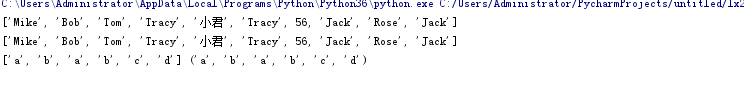 classmates=["Mike","Bob","Tracy","小君","Tracy",56] new=["Rose","Jack"] classmates.insert(2,"Tom") classmates.append("Jack") classmates.extend(new) print(classmates) classmatesSet=set(classmates) classmatesSet.add("Jack") classmatesSet.remove("Bob") print(classmates) print(list("ababcd"),tuple("ababcd"))