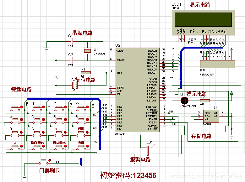 实现的功能包括密码输入开门禁和刷卡开门禁,密码输入功能可以任意修改密码,三次输错报警,掉电存储功能。