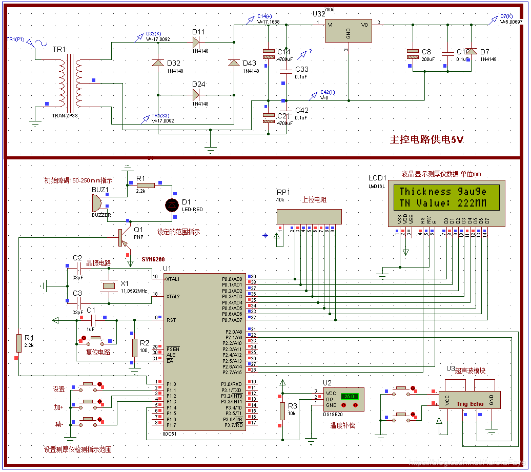 实时通过超声波检测厚度,可以通过按键设定提示范围。包括超声波传感器电路、液晶显示电路、电源电路、单片机电路、提示电路、温度补偿电路、按键电路等。