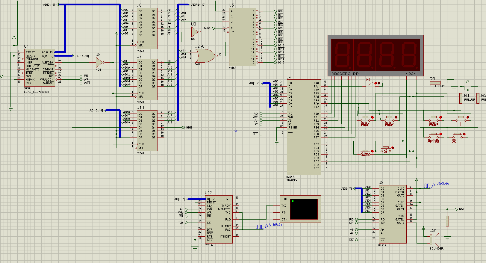 3.将8个键按实验室要求定义键值,按任意键在显示器上显示对应键值,要求显示值能够左移。