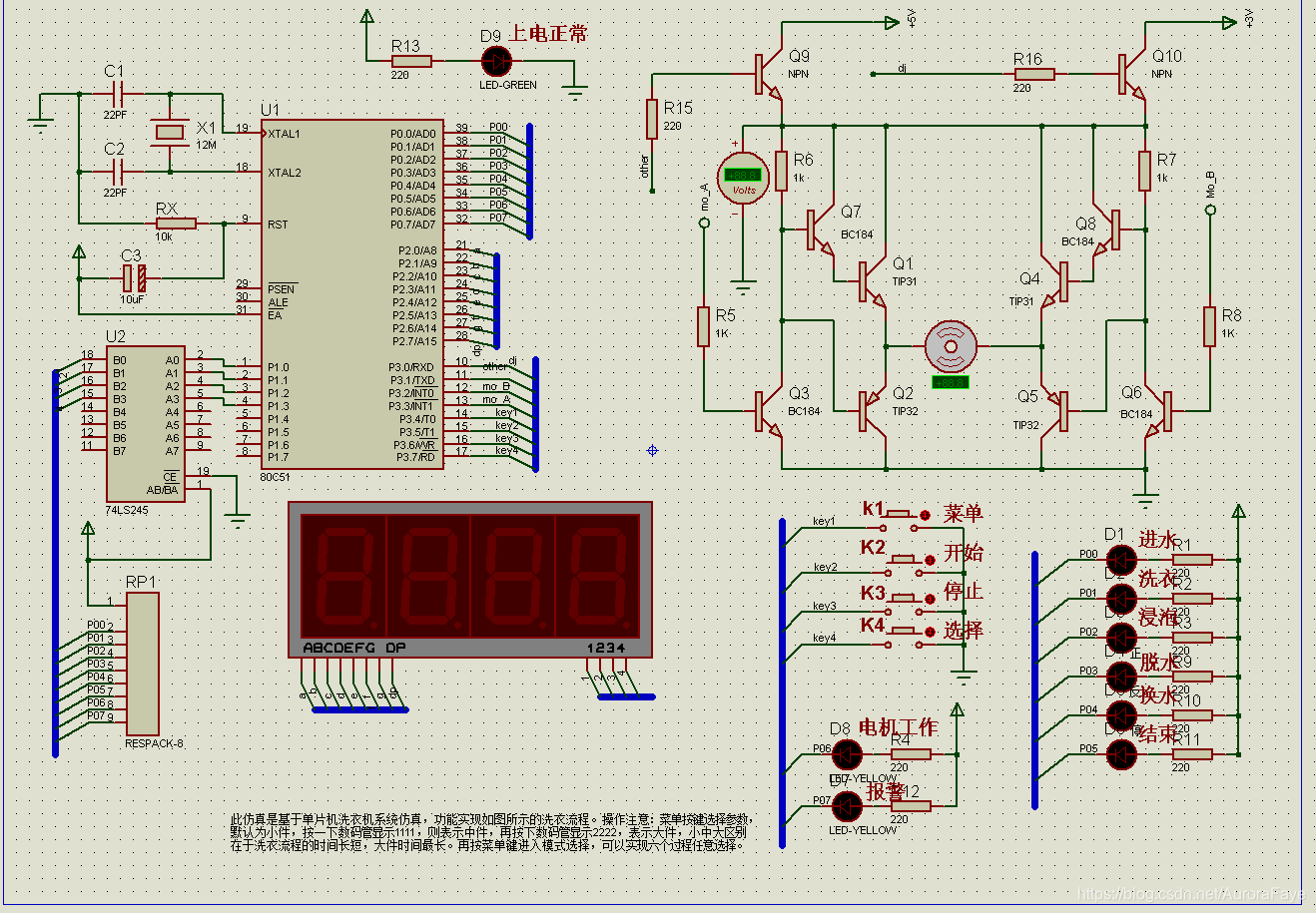 此仿真是基于单片机洗衣机系统仿真,功能实现如图所示的洗衣流程。操作注意:菜单按键选择参数,