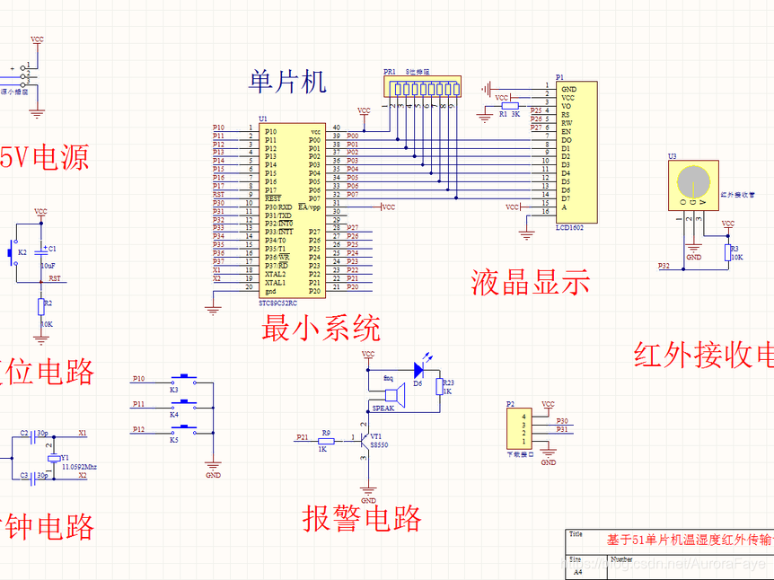 接收机组成:STC89C52RC单片机+LCD1602液晶+红外接收管+蜂鸣器报警+按键。