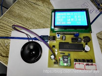 实时时钟运行到定时时间时,LCD1602显示此次用药量,蜂鸣器响起,LED闪烁,提醒用药时间到。