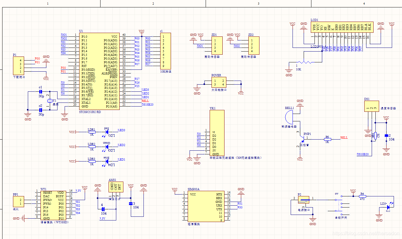 基于单片机的GSM振动报警系统,两个震动检测模块,检测到震动,GSM短信,电话报警,语音报警,温度过高检测GSM短信,电话报警,可手动通过遥控开闭报警,语音报警,扬声器在板子下面,无线遥控控制开闭,程序,原理图,PCB图源文件。