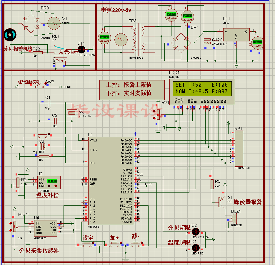 016【毕设课设】基于单片机声音分贝采集和显示控制系统设计,实时检测声音分贝大小,并可以通过手动设定分贝报警范围,当超过设定范围时则发生声光报警。包括的电路有声光报警电路,传感器采集电路,显示电路,温度补偿电路,电源电路,单片机电路,按键电路等。