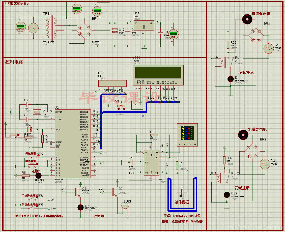 通过液位传感器进行检测,实时监测水位大小。当超过设定范围时则进行报警,并通过进液泵和出液泵控制水位位置。分别有设定手动控制和自动控制,并有电源电路。包含的电路有显示电路、按键电路,显示电路,电机电路,传感器电路,声光报警电路,电源电路。