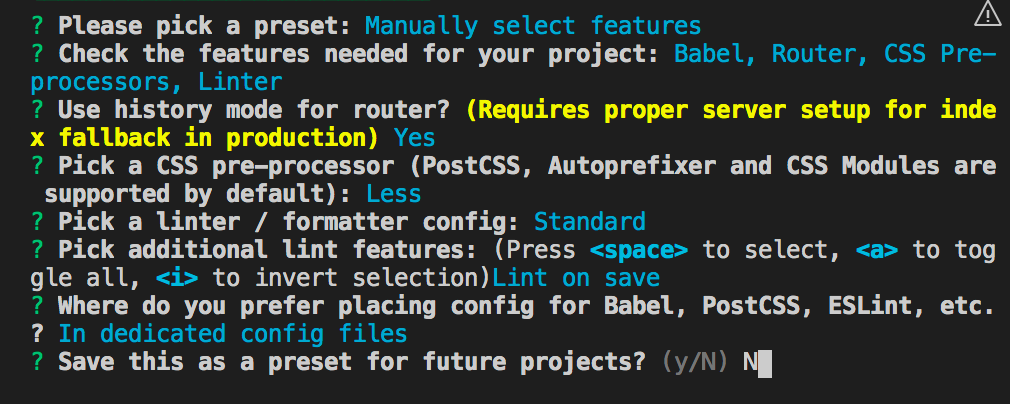 使用history模式来创建路由(是),CSS预处理模式(Less)。