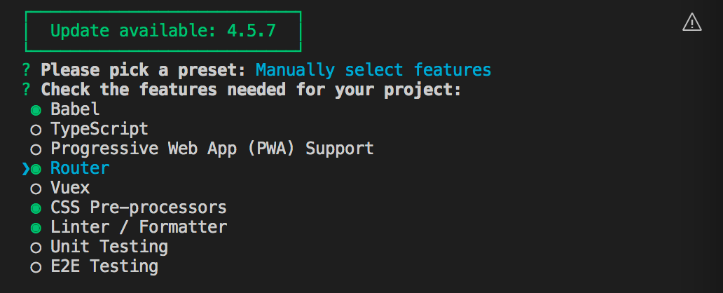 选择Babel、Router、CSS Pre-processors及Linter / Formatter。
