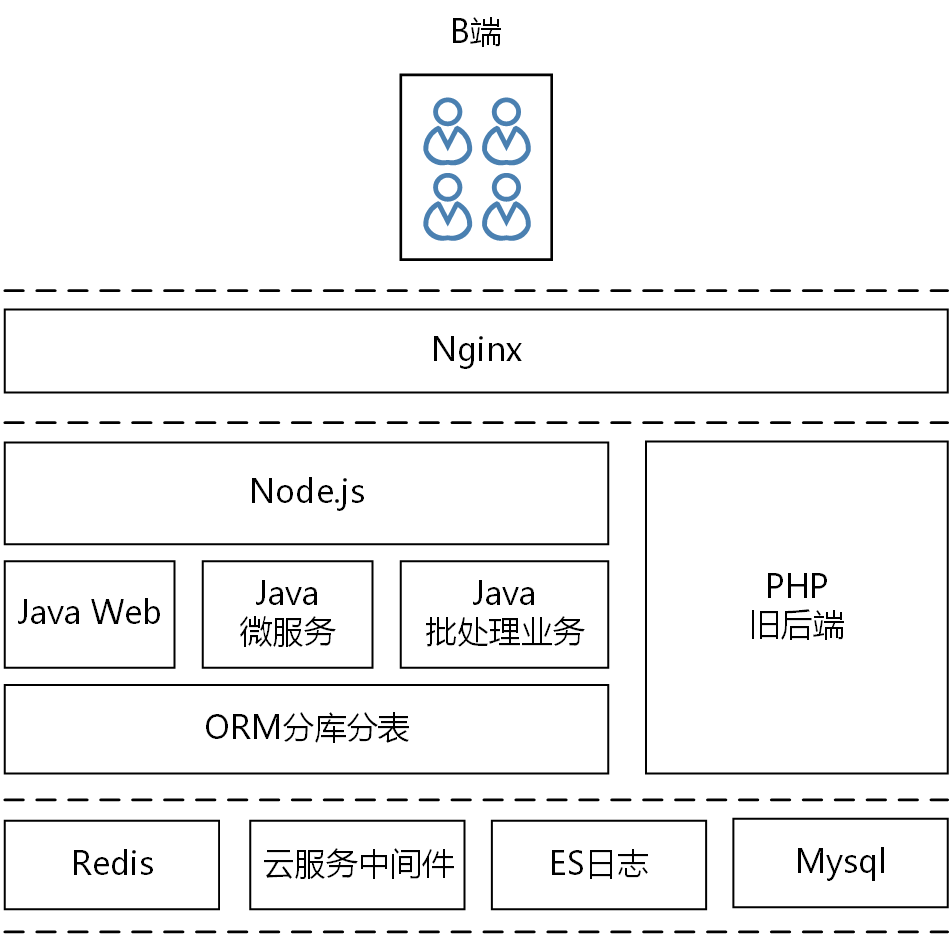 整个B端的技术栈架构我简单用一张图表示。到我离职以前,整个组还在进行部分技术栈的迁移,按计划以后所有的PHP业务都会用Java重写。待续
