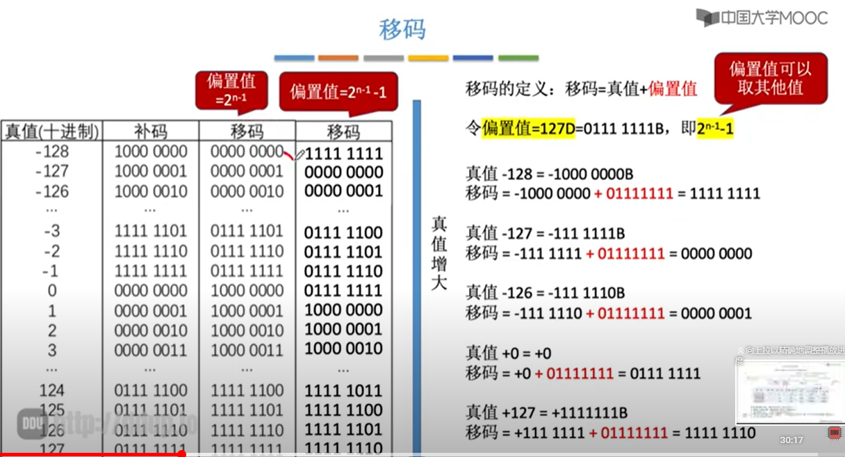 注意:补码的基础上将符号位取反,移码只能用于表示整数。