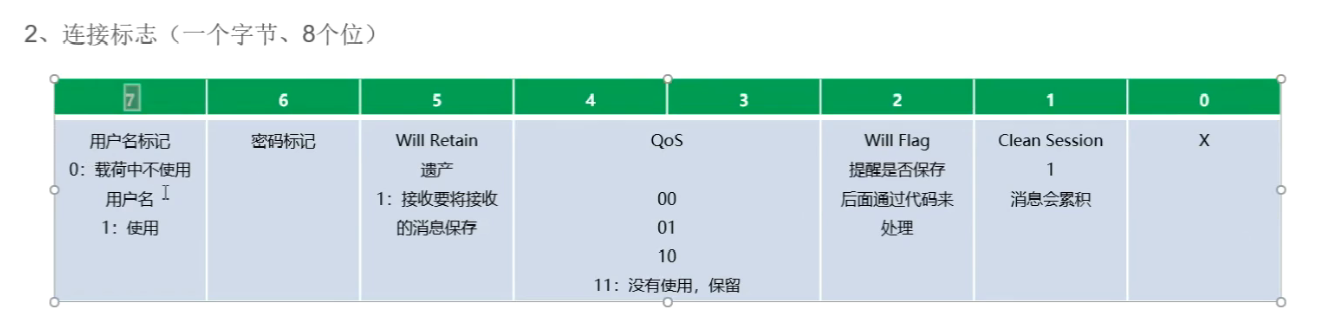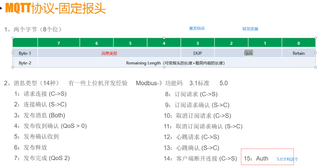 1 、 固定报头共2个字节,一个字节占8位。第一个字节前4位是用于指定控制报文类型的标志位,后4位是控制报文类型;第二个字节是剩余长度。