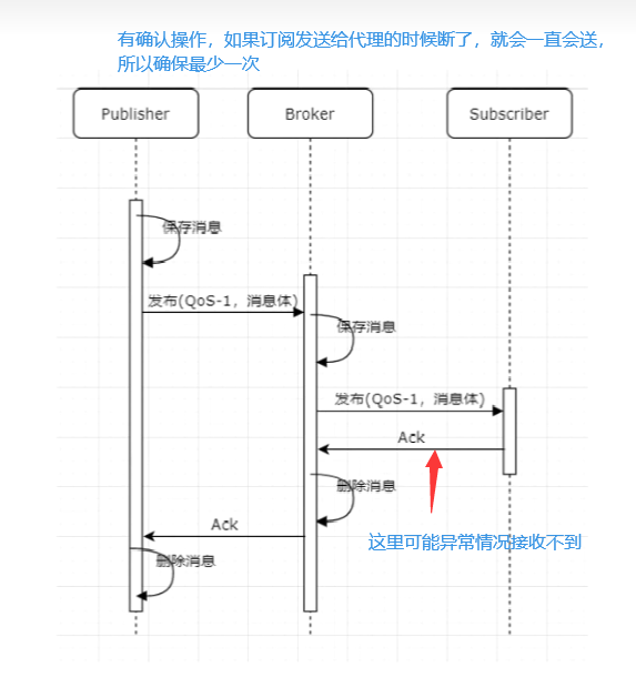 2 至少一次传输,QOS=1 ,订阅像代理确认的时候可能断开,就确保最少一次,这个有确认操作