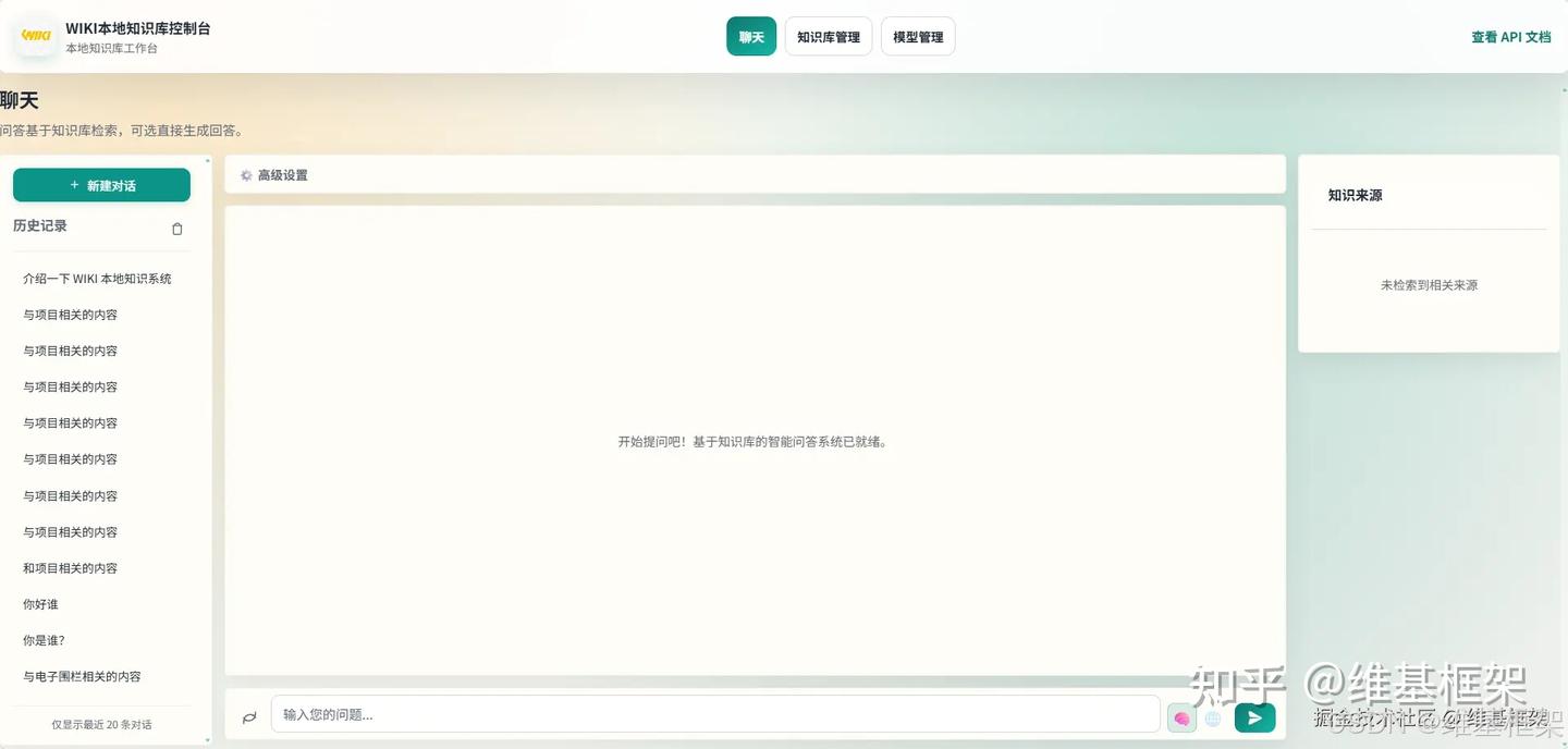 WIKI 知识库是一款本地优先的私有知识库服务,集成了向量检索与**对话式问答(RAG)**能力。它通过 HTTP API 和 Web 界面向用户提供服务,支持 SSE 流式输出,并内置多用户会话管理、知识库文档管理、模型配置等完整功能。