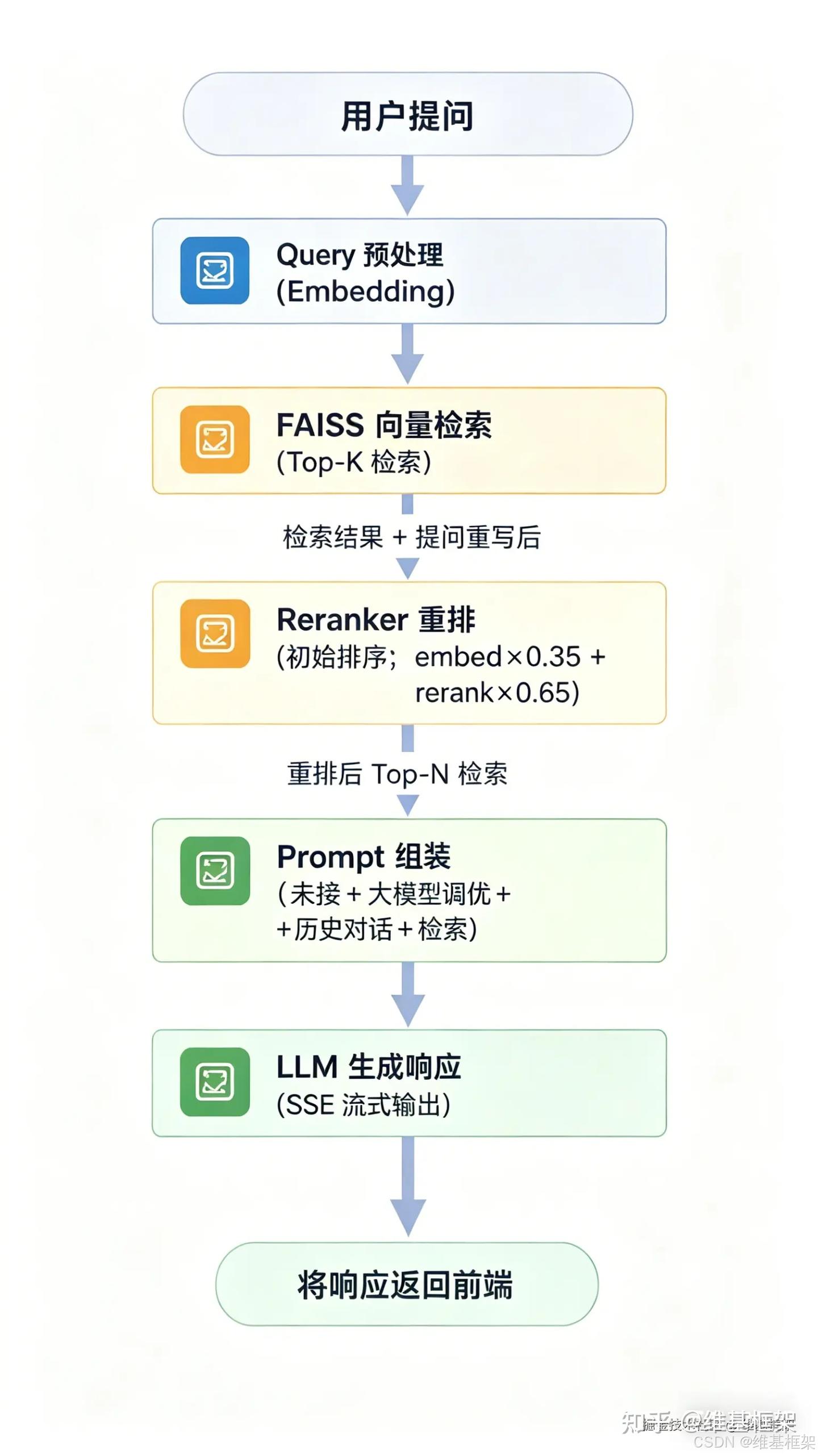 文档解析 → 文本分块 → 向量化 → FAISS 索引 → 向量检索 → Rerank 排序 → LLM 生成 → SSE 流式输出