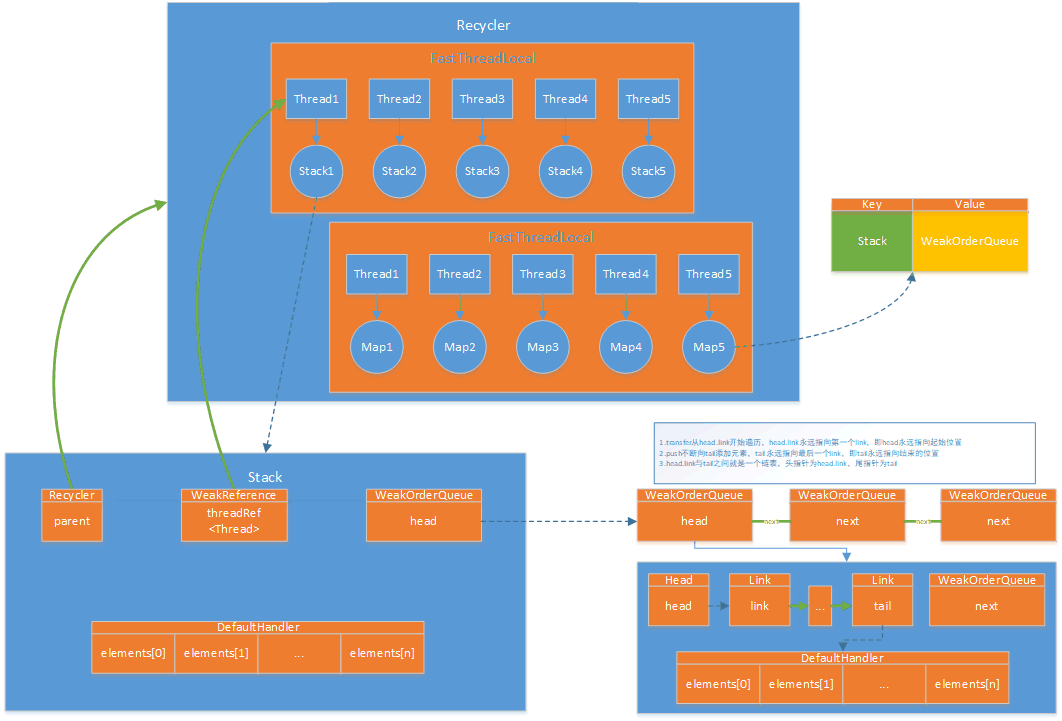 - 当多个非当前线程push元素时,各个线程都互不影响,因为其对应的WeakOrderQueue都保存在线程共享变量中。如果在A、B线程中同时调用与线程C绑定的stack的push,那么从DELAYED_RECYCLED取出的map都是线程独有的,所以map保存的WeakOrderQueue并不冲突。而为了把这些WeakOrderQueue联系起来,又通过stack的head属性,将这些queue串起来。真正需要加锁的地方,只有setHead这一步,所以效率很高
