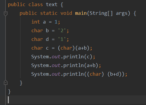 System.out.println((char)('0'+'A'));// q 强转char --输出char