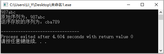 1 #include<stdio.h> 2 #include<String.h> 3 int main(){ 4 char str[100],str2[100]; 5 int len; 6 int i,j; 7 scanf("%s",str); 8 len = strlen(str); 9 for(i=0,j=len-1;i<len && j>=0;i++,j--){ 10 str2[i] = str[j]; 11 } 12 printf("原始序列为:%s\n",str); 13 printf("逆序存放的序列为:%s\n",str2); 14 return 0; 15 }