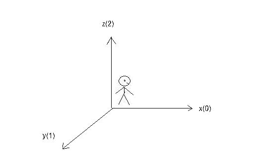 宇航员在太空中迷失了方向,在他的起始位置现在建立一个虚拟xyz坐标系,称为绝对坐标系,宇航员正面的方向为x轴正方向,头顶方向为z轴正方向,则宇航员的初始状态如下图所示: