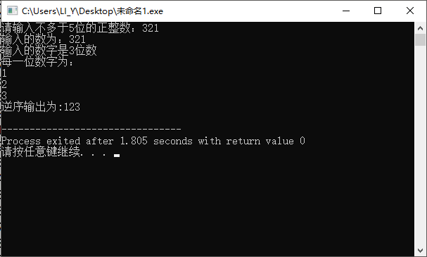 1 #include<stdio.h> 2 #include<math.h> 3 int main(){ 4 5 int a,b,result=0; //a用于输入,b用于运算,result用于存放逆序结果 6 int len=0; //表示数字的位数 7 int c[5]={0}; //存放数字中的每一位 8 int i; 9 printf("请输入不多于5位的正整数:"); 10 scanf("%d",&a); 11 b = a; 12 for(len=0; b!=0; b=b/10){ 13 c[len] = b%10; 14 len++; 15 } 16 printf("输入的数为:%d\n",a); 17 printf("输入的数字是%d位数\n",len); 18 printf("每一位数字为:\n"); 19 for(i=0;i<len;i++){ 20 printf("%d\n",c[i]); 21 result = result*10+c[i]; 22 } 23 printf("逆序输出为:%d\n",result); 24 return 0; 25 }