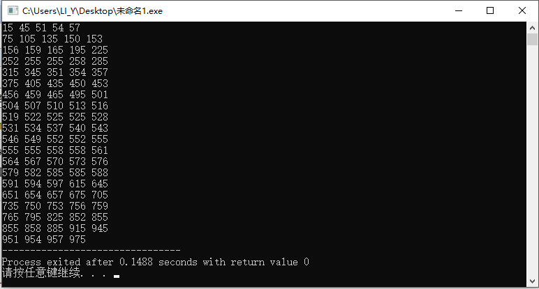 1 #include<stdio.h> 2 int main(){ 3 int i,j; 4 int flag = 0; //标志用于换行 5 int temp; //运算变量 6 for(i=1; i<1000; i++){ 7 temp = i; 8 if(temp%3 == 0){ 9 while(temp != 0){ 10 if(5 == temp%10){ 11 printf("%d ",i); 12 flag++; 13 if(flag%5 == 0){ 14 printf("\n"); 15 } 16 } 17 temp = temp/10; 18 } 19 } 20 } 21 }