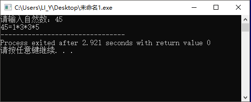 1 #include<stdio.h> 2 int main(){ 3 int a; //用于输入 4 int i=2; 5 printf("请输入自然数:"); 6 scanf("%d",&a); 7 printf("%d=1*",a); 8 while(a!=1){ 9 if(a%i==0){ 10 printf("%d",i); 11 a = a / i; 12 if(a!=1){ 13 printf("*"); 14 } 15 }else{ 16 i++; 17 } 18 } 19 return 0; 20 }
