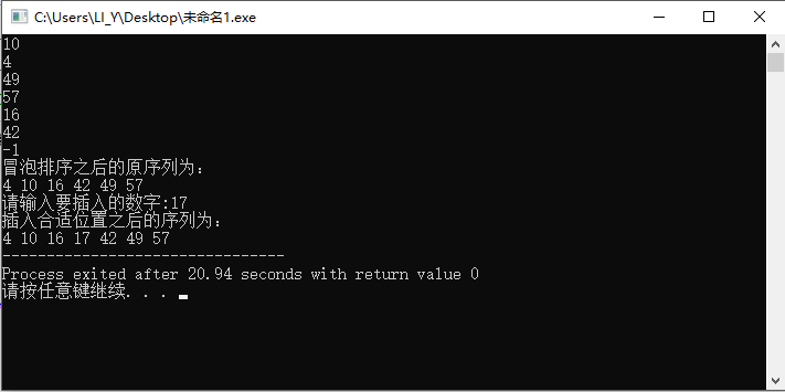 1 #include<stdio.h> 2 #define NUM 20 3 void BubbleSort(int a[],int len); 4 int main(){ 5 int a[NUM]; //存放数据 6 int len=0; //表示数组中数据的个数 7 int b; //存放插入的数字 8 int i; 9 scanf("%d",&b); 10 while(b!=-1){ //循环输入原始数据 11 a[len] = b; 12 len++; 13 scanf("%d",&b); 14 } 15 BubbleSort(a,len); //冒泡排序 16 printf("冒泡排序之后的原序列为:\n"); 17 for(i=0; i<len; i++){ 18 printf("%d ",a[i]); 19 } 20 printf("\n"); 21 if(len<NUM){ //插入数据并移位放入合适位置 22 printf("请输入要插入的数字:"); 23 scanf("%d",&b); 24 i = len-1; 25 while(a[i]>b){ 26 a[i+1] = a[i]; 27 i--; 28 } 29 a[i+1] = b; 30 len++; 31 } 32 printf("插入合适位置之后的序列为:\n"); 33 for(i=0; i<len; i++){ 34 printf("%d ",a[i]); 35 } 36 return 0; 37 } 38 39 void BubbleSort(int a[], int len){ 40 int i,j; 41 int flag = 0; 42 int temp; 43 for(i=0;i<len; i++){ 44 for(j=1;j<len-i;j++){ 45 if(a[j]<a[j-1]){ 46 temp = a[j]; 47 a[j] = a[j-1]; 48 a[j-1] = temp; 49 flag = 1; 50 } 51 } 52 if(flag == 0){ 53 break; 54 } 55 } 56 }