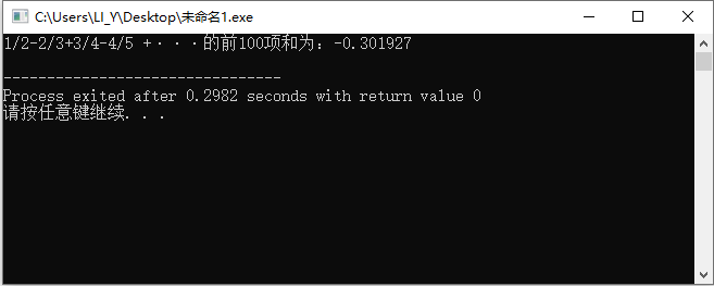 1 #include<stdio.h> 2 int main(){ 3 double sum=0.0; 4 float i; 5 int flag = 1; 6 for(i=2.0; i<102; i=i+1){ 7 if(flag == 1){ 8 sum += (i-1.0)/i; 9 flag = -1; 10 }else{ 11 sum -= (i-1.0)/i; 12 flag = 1; 13 } 14 } 15 printf("1/2-2/3+3/4-4/5 +···的前100项和为:%lf\n", sum); 16 return 0; 17 }