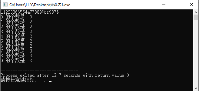 1 #include<stdio.h> 2 int main(){ 3 char str[100]; 4 int n[10]; 5 int i,j; 6 int len=0; 7 for(i=0; i<10; i++){ 8 n[i] = 0; 9 } 10 while(1){ //读取字符 11 scanf("%c",&str[len]); 12 len++; 13 if(len>=100 || str[len-1]=='$'){ 14 break; 15 } 16 } 17 for(i=0; i<len; i++){ //统计字符 18 if(str[i]>='0' && str[i]<='9'){ 19 n[str[i]-'0']++; 20 } 21 } 22 for(i=0; i<10; i++){ 23 printf("%d 的个数是: %d\n",i,n[i]); 24 } 25 return 0; 26 }